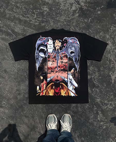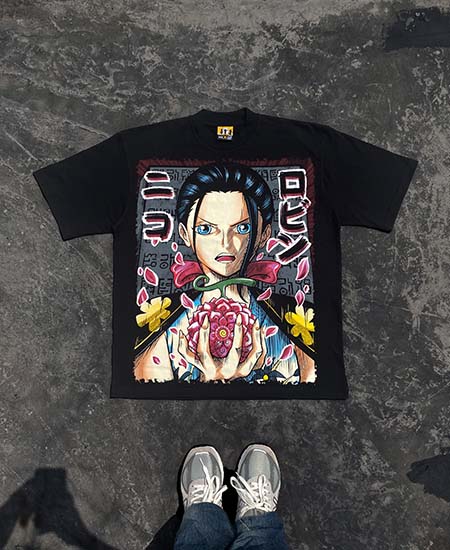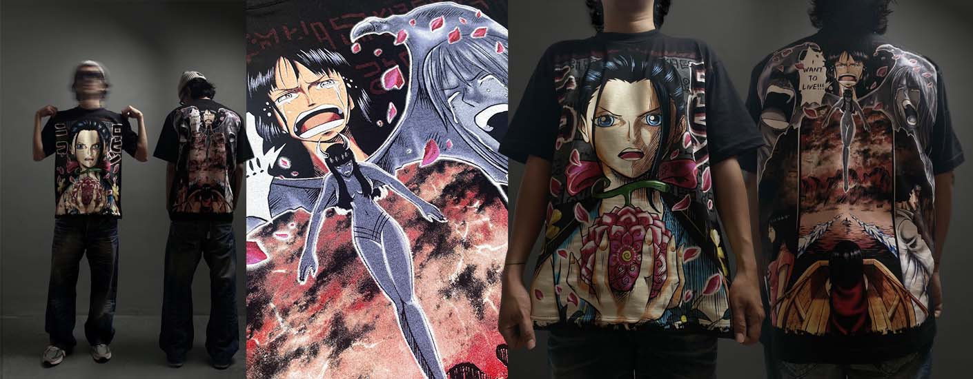 Ada 4 karakter yang di gambarkan dalam design back t-shirt ini, yaitu Nico Olvia Ibu dari Nico Robin, Saul D. Jaguar, Aokiji, dan Monkey D. Luffy